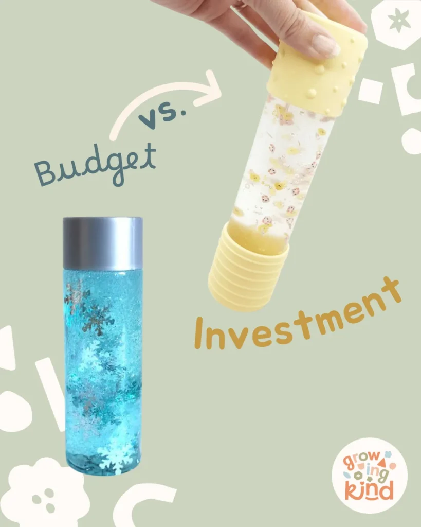 Calm Down Bottles: use an old water bottle and add some glitter, gelatine powder and water. Alternatively invest in a Calm Down Bottle that can be used again by adding new inserts.