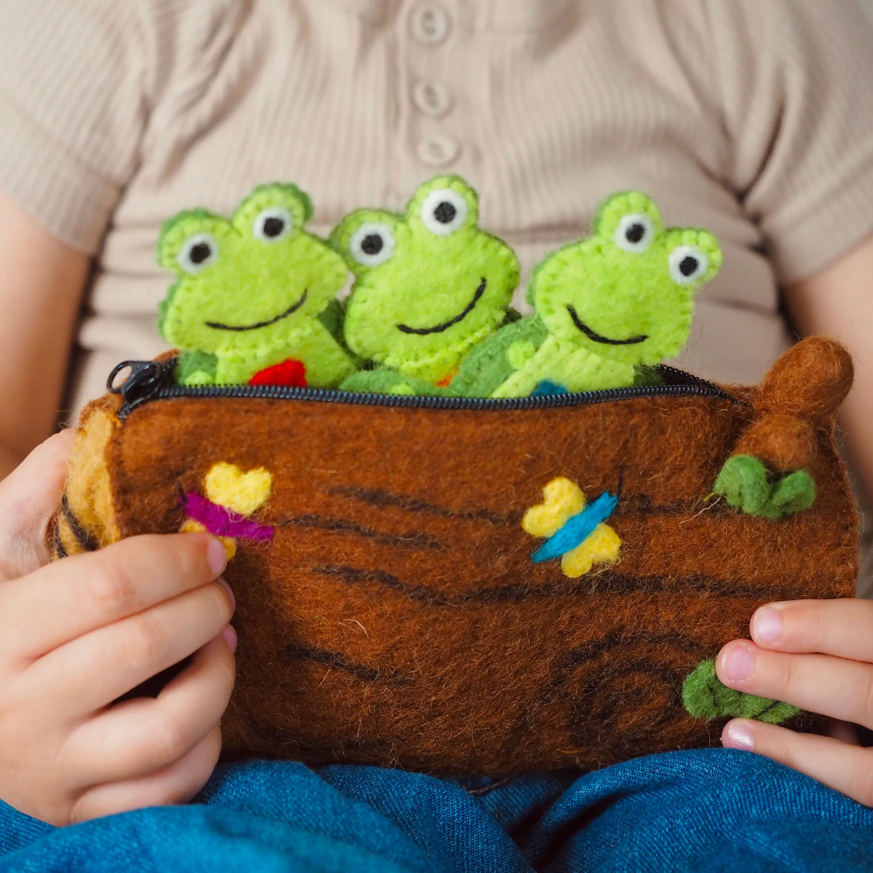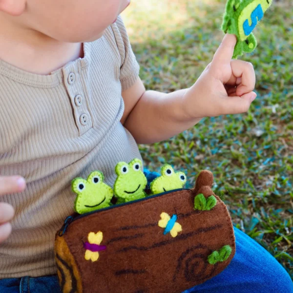 Includes: 5 frog finger puppets and 1 felt log purse