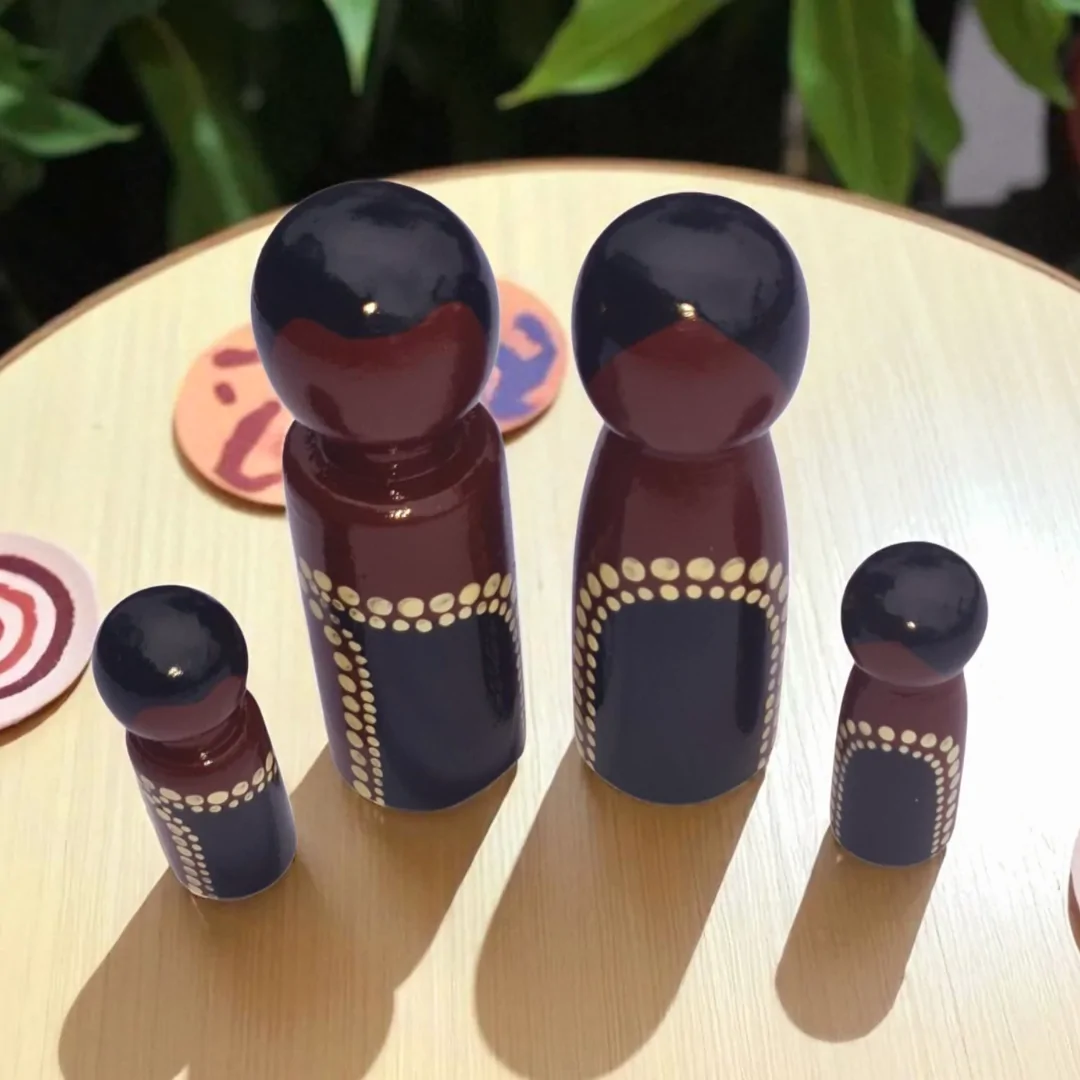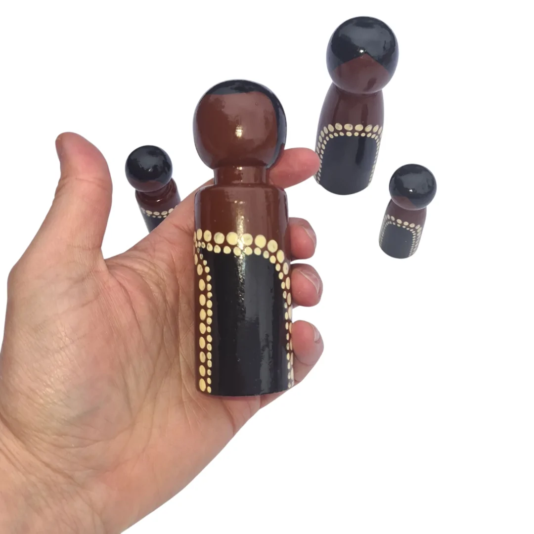 The Aboriginal Dot Peg Doll Family – Black & White Edition by Primary Toys is a beautiful, hand-painted set designed to inspire storytelling, role play, and meaningful conversations with children. Featuring traditional Aboriginal-inspired dot painting in striking black and white, this family of peg dolls is both a play resource and a cultural keepsake.