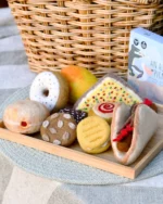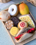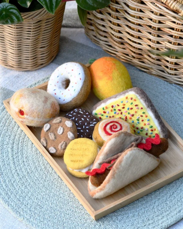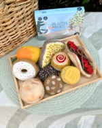 This delightful handcrafted set is filled with soft felt versions of Australia’s most iconic snacks and sweets. Perfect for imaginative role play, café setups, and sensory storytelling, each piece is carefully stitched from eco-friendly felt, offering a fun and educational way to explore food culture through play.