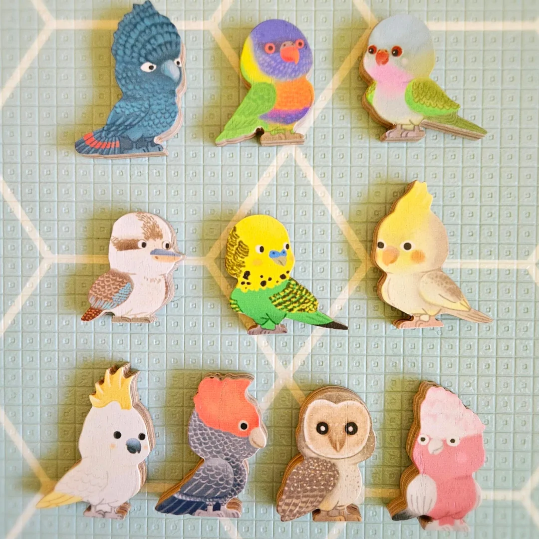 A set of 10 handcrafted wooden Australian birds, each representing a unique native species.