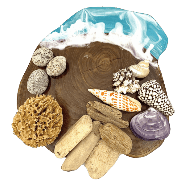 A mixed set of goodies you might find on a beach; shells, rocks, driftwood, maybe even a sponge. Of course, as all these items are natural there will be variation in size and colour and we may substitute shells if necessary.