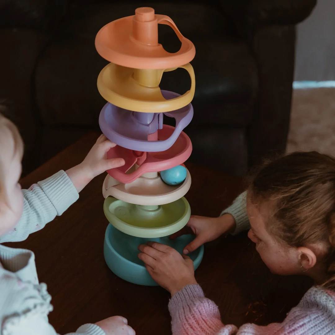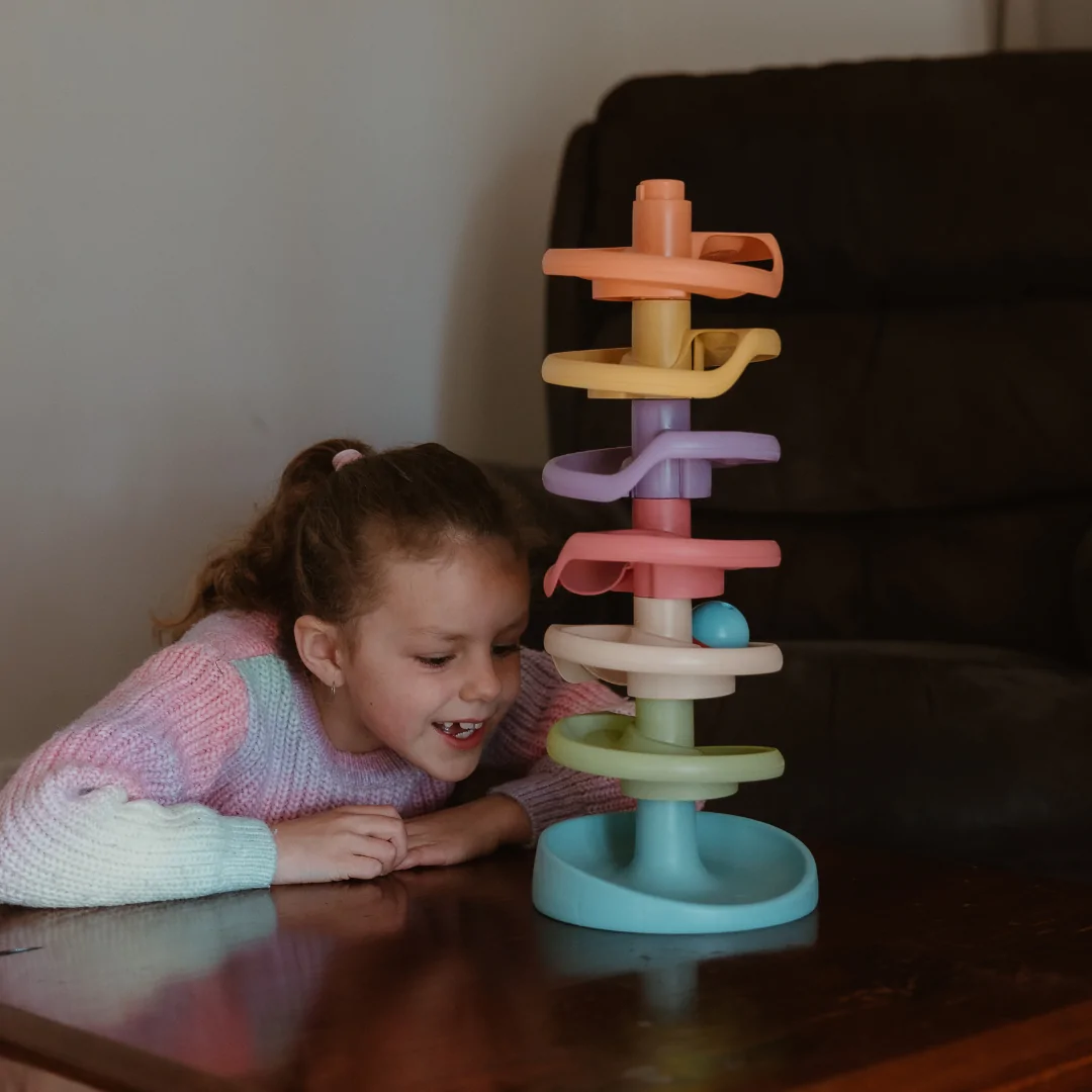 Watch your toddler build and explore with this Spiral Tower Ball Run! Perfect for little hands and curious minds, this vibrant construction set invites your child to create their own towering masterpiece while learning the basics of force and gravity. The 10-piece set includes seven colourful tower pieces and three balls, all made from 100% biodegradable materials.