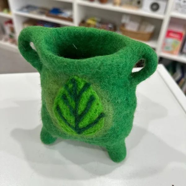 Lovingly hand-felted and stitched by skilled artisans, this cauldron is made from 100% natural and non-toxic wool. The beautifully detailed green leaf design adds a nature-inspired touch, making it both enchanting and environmentally conscious.