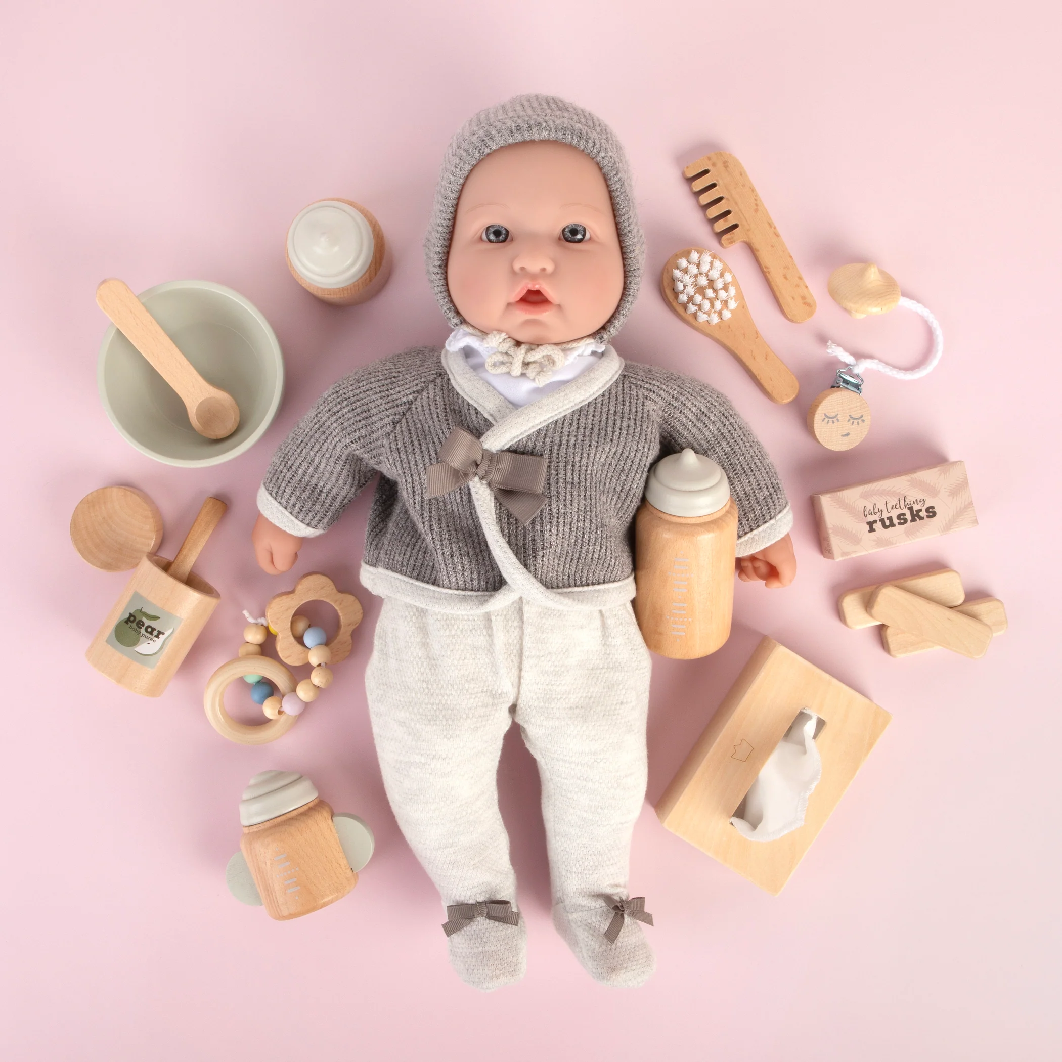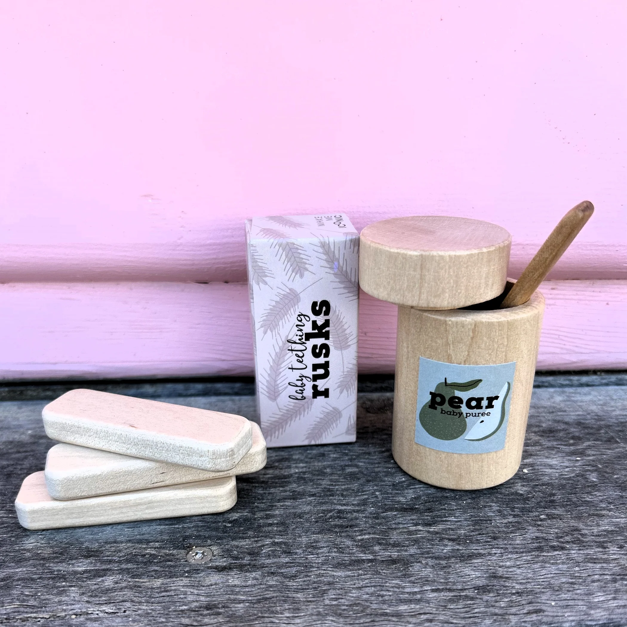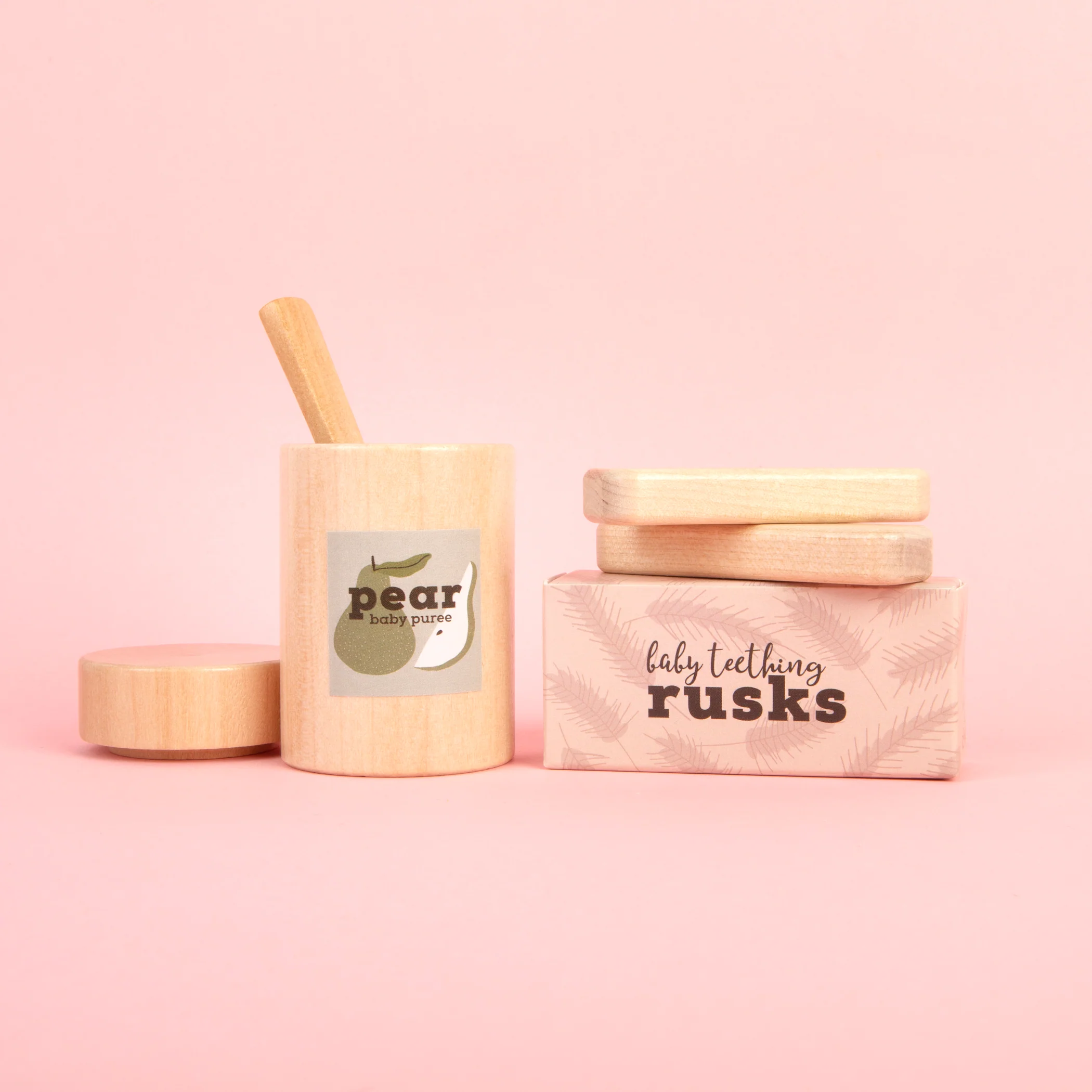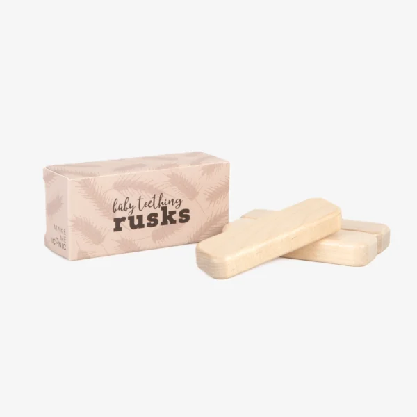 Each set includes three smooth, durable wooden rusks and a beautifully printed cardboard storage box. Whether kids are setting up a doll picnic or caring for a sick teddy, these rusks bring realism and charm to role play.