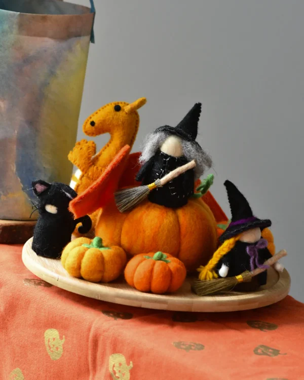 Add a sprinkle of mystery and a dash of Halloween charm to your small world play with this enchanting Felt Black Cat Peg Doll. Dressed in a sleek felt coat and handcrafted with love, this mystical kitty is the perfect sidekick for peg doll witches, magical scenes, or year-round pretend play.