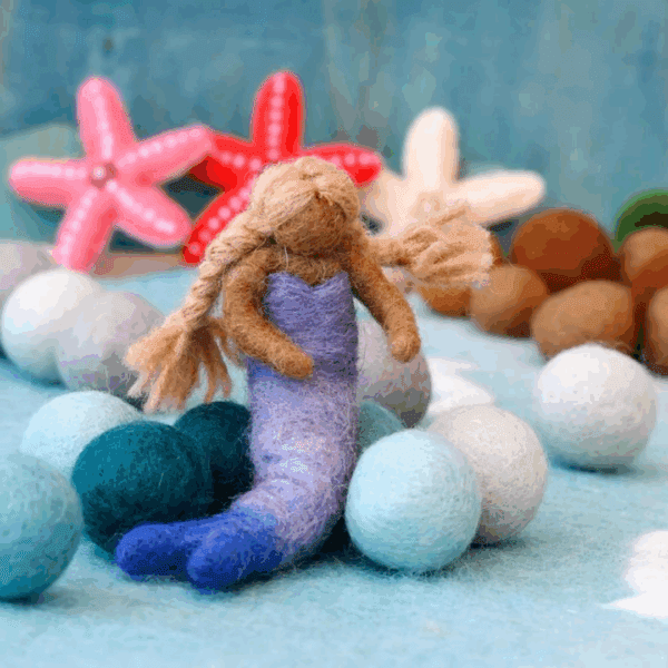 Needle-felted and ethically handmade, create a mystical under-the-sea play set up with this Waldorf-inspired mermaid with sandy hair.