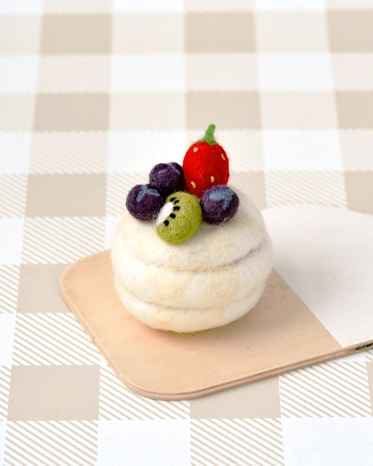 Indulge in the sweet, iconic taste of Australia and New Zealand with our beautifully handcrafted Felt Pavlova. Featuring a delicate meringue base, a generous swirl of whipped cream, and a vibrant topping of colourful felt fruits, this pretend play dessert is a showstopper in any play kitchen or tea party.