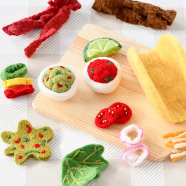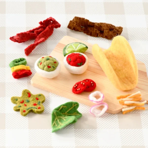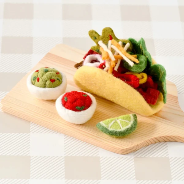Bring pretend kitchens and plushie picnics to life with our delightful Felt Taco Set, designed to ignite curiosity, creativity, and culinary fun! This deconstructed taco encourages kids to layer, stack, and build their own tacos, offering endless role-play possibilities in every bite (of imagination).