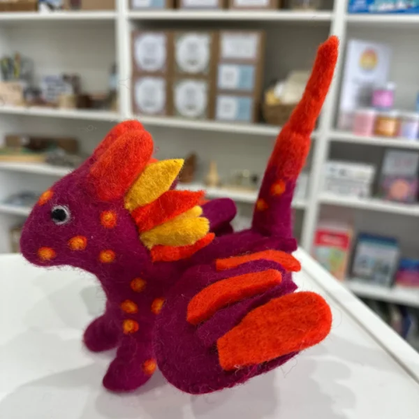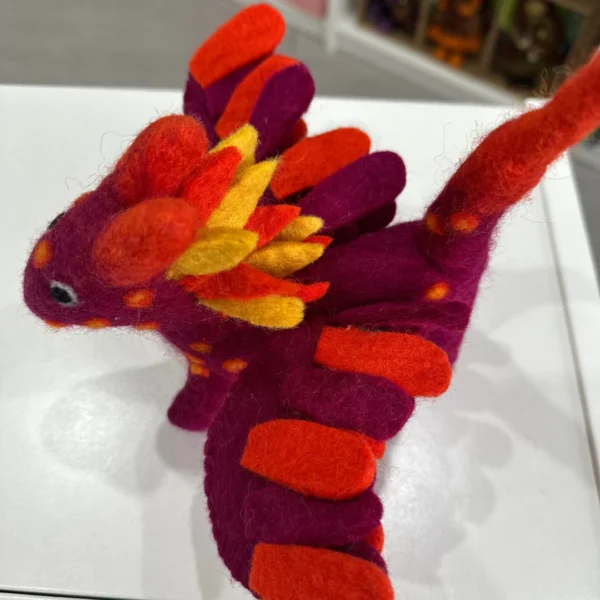 Lovingly made from 100% natural wool, this fire dragon is hand-felted and stitched by skilled artisans. The vibrant colours and intricate details make it a standout piece for imaginative play or as a decorative item.