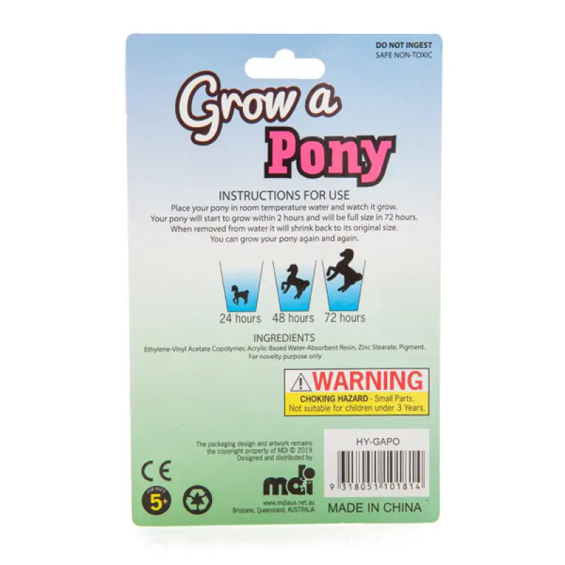 Saddle up for some magical fun and grow your very own pony. Simply place the tiny pony in water and over time it will slowly expand, growing up to six times its original size.