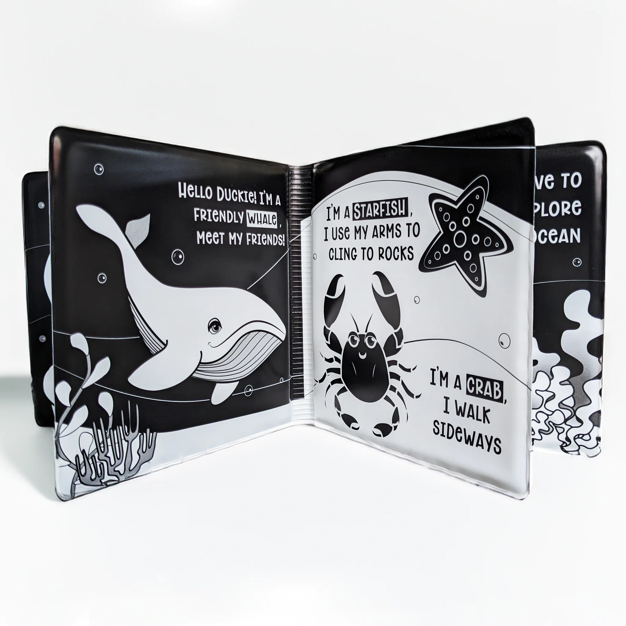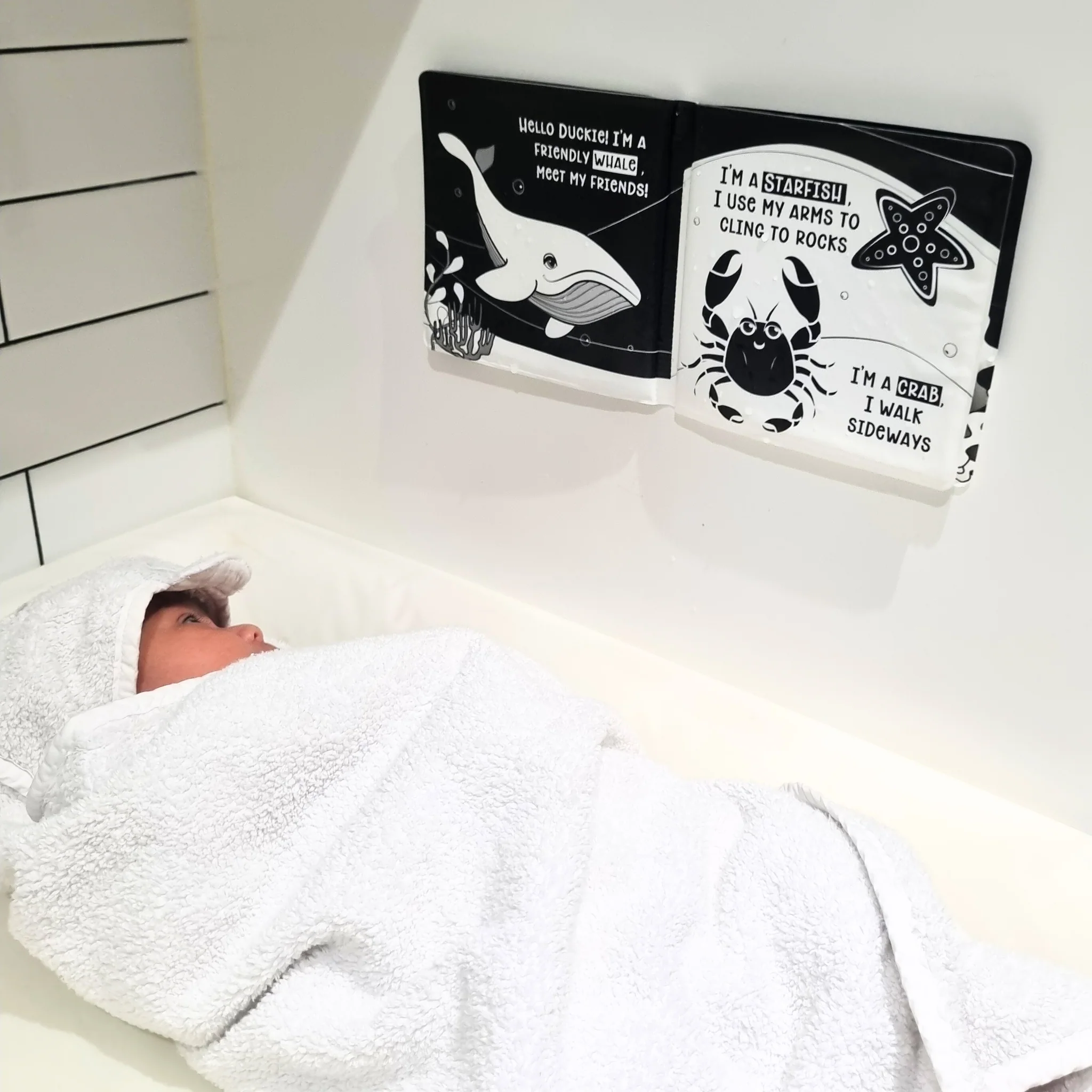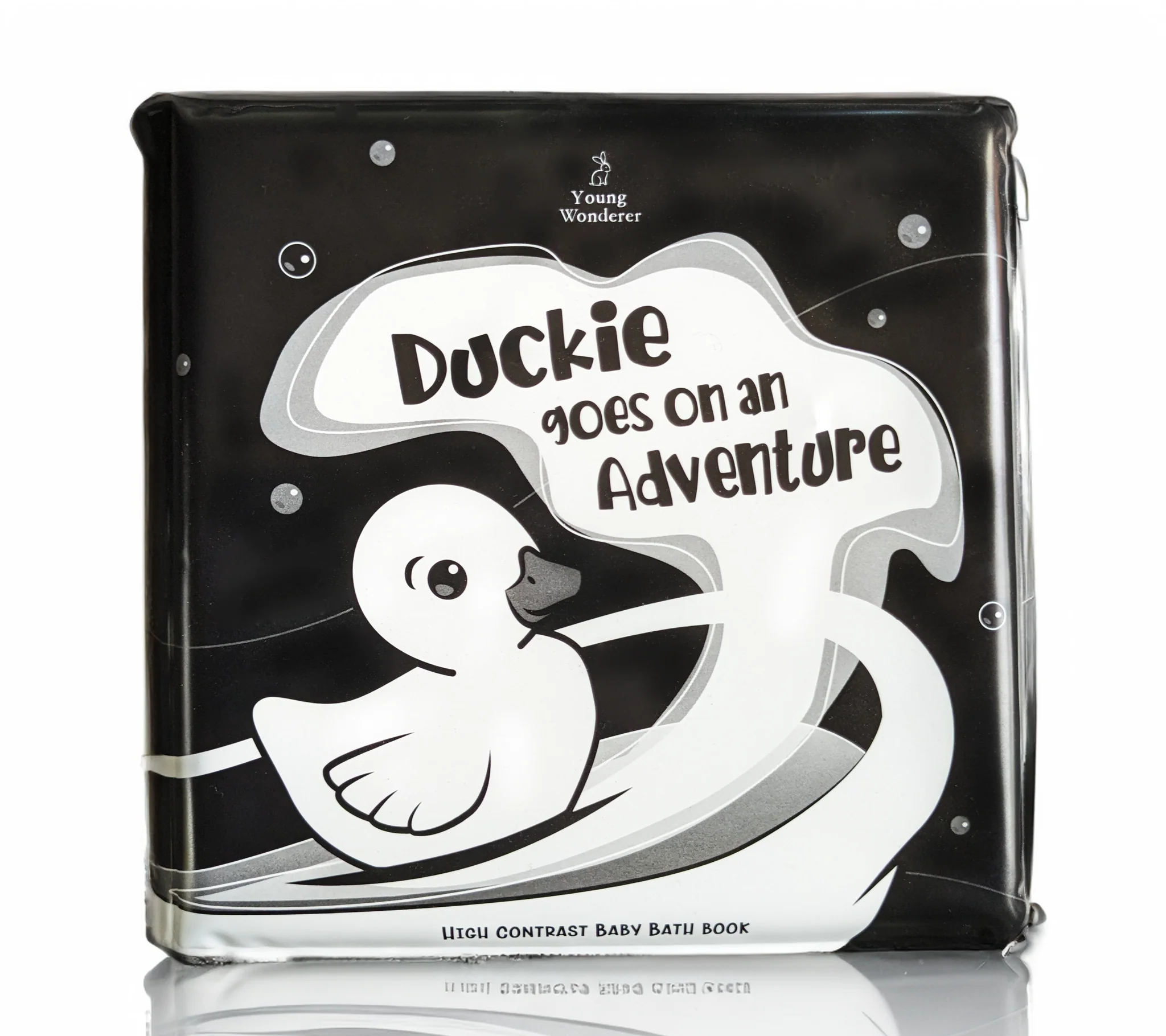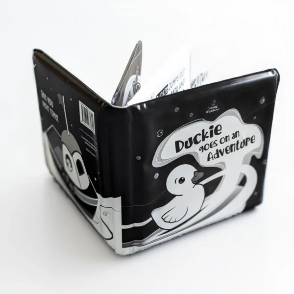 Make bath time both fun and developmentally enriching with Duckie Goes On An Adventure – a waterproof black and white bath book designed to support your baby’s early vision and cognitive development.