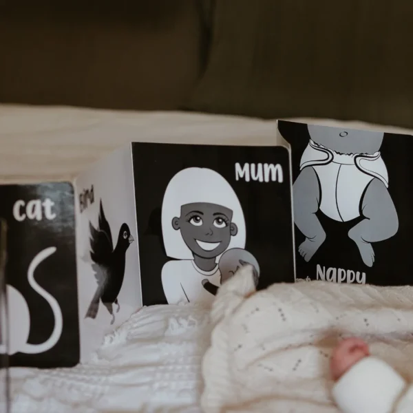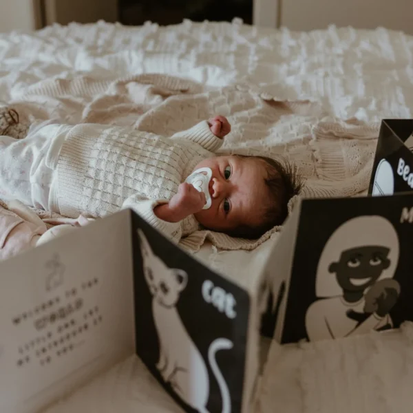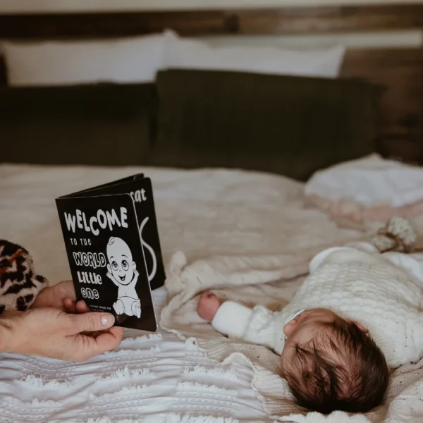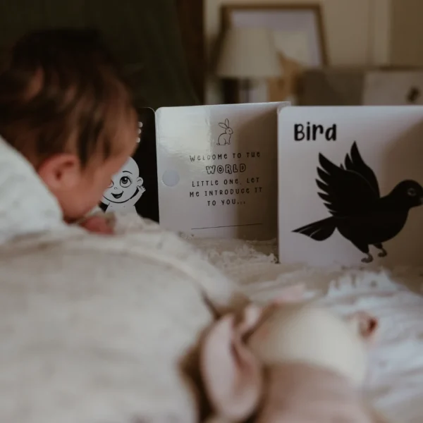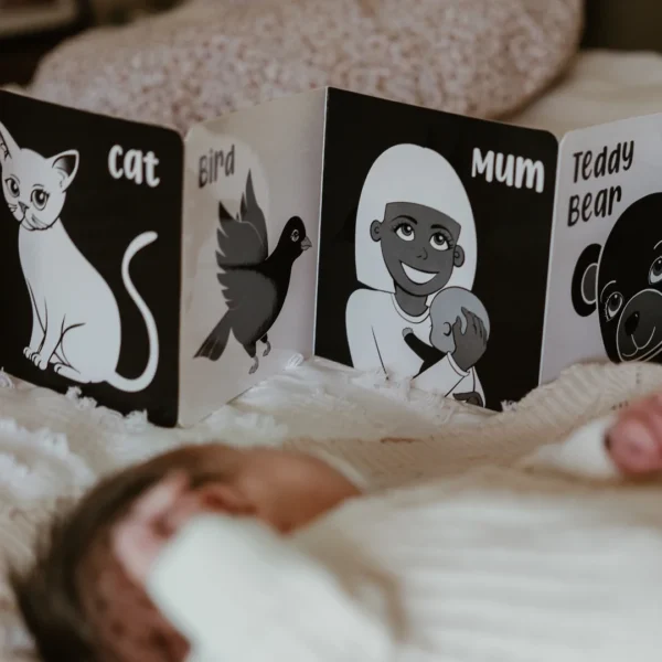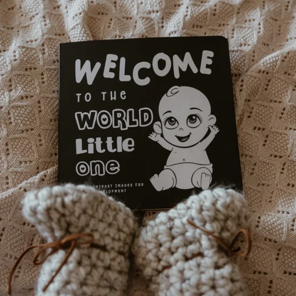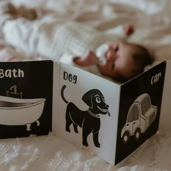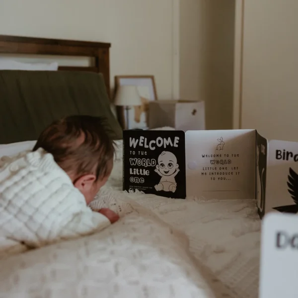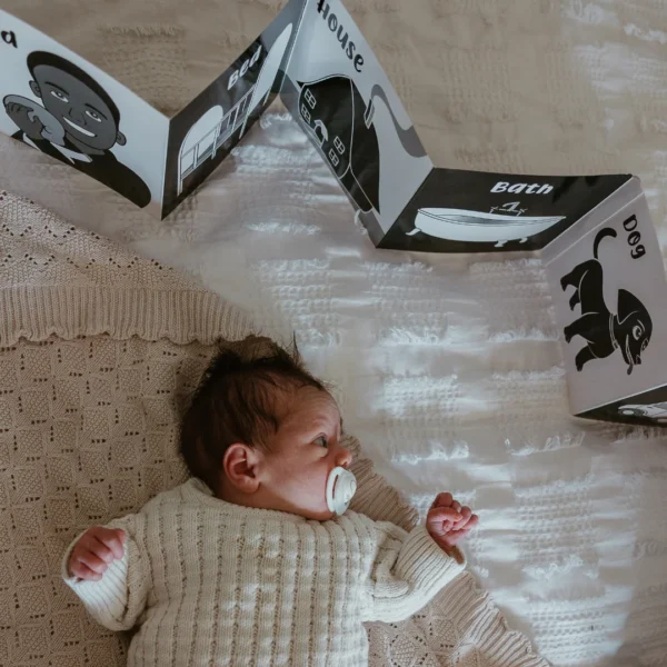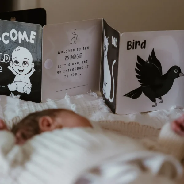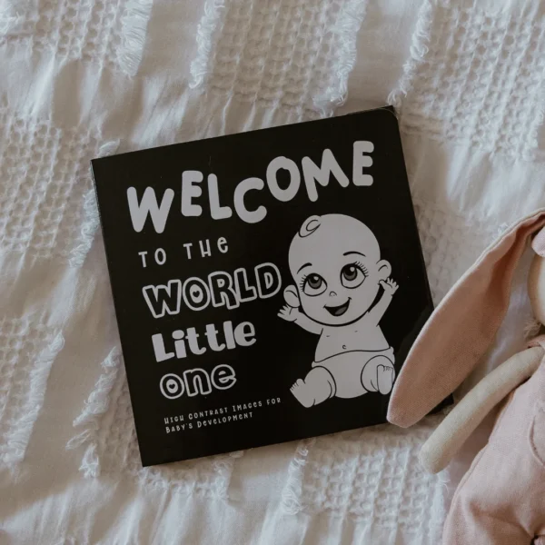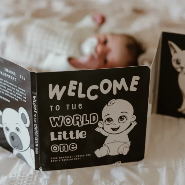 Support your baby’s early development with Welcome To The World Little One, a beautifully illustrated black and white book designed to stimulate visual focus and cognitive growth from day one. Newborns naturally respond to high contrast images, and this accordion-style book offers just that – a self-standing visual journey filled with simple first words and bold shapes to captivate curious little eyes.