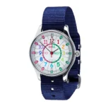 Whether at the beach, in the pool, or out exploring, this Waterproof Kids Watch with a rainbow face and durable navy nylon strap is the perfect companion for active kids learning to tell the time. Designed for children aged 4+, it features a clear, colour-coded dial that makes learning hours and minutes simple and fun.