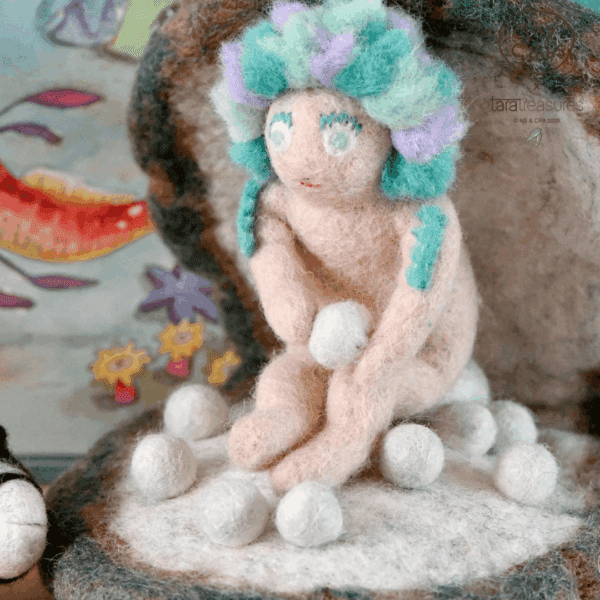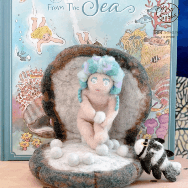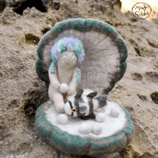 Little Obelia, holding a pearl, the Clam Shell, and Fish are each crafted as individual pieces, offering endless storytelling possibilities. Little Obelia, once sleeping in a pearl at the sea bottom, has grown wise and now reigns as Queen of the Fish Folk, a character steeped in May Gibbs’ timeless charm.