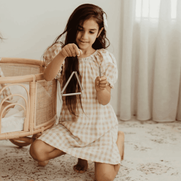 Perfectly sized for little hands, this instrument encourages fine motor development as children grasp the string and strike the steel triangle. It’s an engaging way to explore sound, rhythm, and cause and effect – a wonderful introduction to the joy of music.