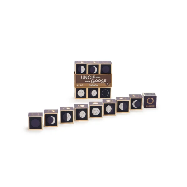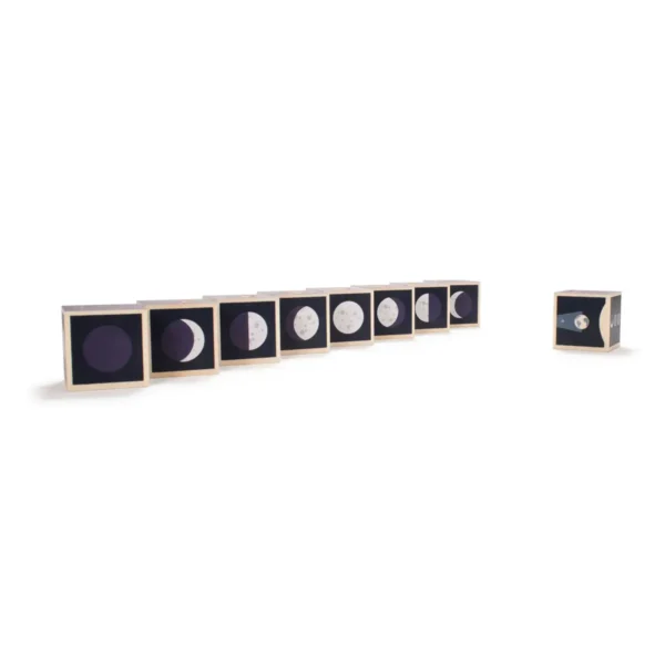 Introduce children to the mysteries of the moon with this beautifully crafted Moon Phase Blocks Set. This 9-piece wooden block set showcases all 8 moon phases, plus a special block dedicated to the lunar eclipse. With debossed and printed details, children will discover moon rise and set times, tidal effects, and each phase’s position relative to the sun.