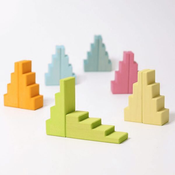 Use them to create rooftops, grand staircases, or as bridges and platforms between levels. When paired with other Grimm’s construction sets, these stepped blocks help children design magical worlds, complete with towers, villages, or fairy castles that can be climbed and explored.