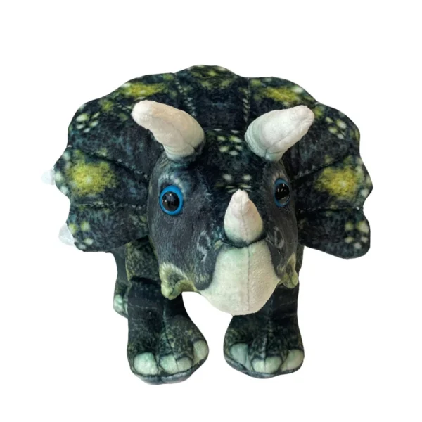 This plush toy features the distinctive three-horned face and shield-like frill of the beloved Triceratops, brought to life with vibrant colors and soft textures.