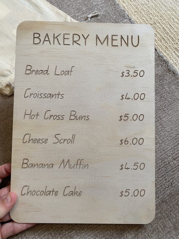 This menu is made of plywood and can be stuck to a wall, or alternatively paired with the wooden A4 stand (not included).