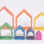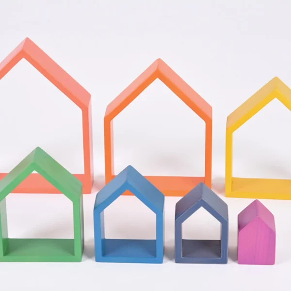 The Rainbow Architect Houses – 7pk is a stunning open-ended play set designed to inspire creativity, construction, and storytelling. Each of the seven wooden houses nests inside one another, beautifully finished in vibrant rainbow colours and crafted from smooth, child-safe wood.