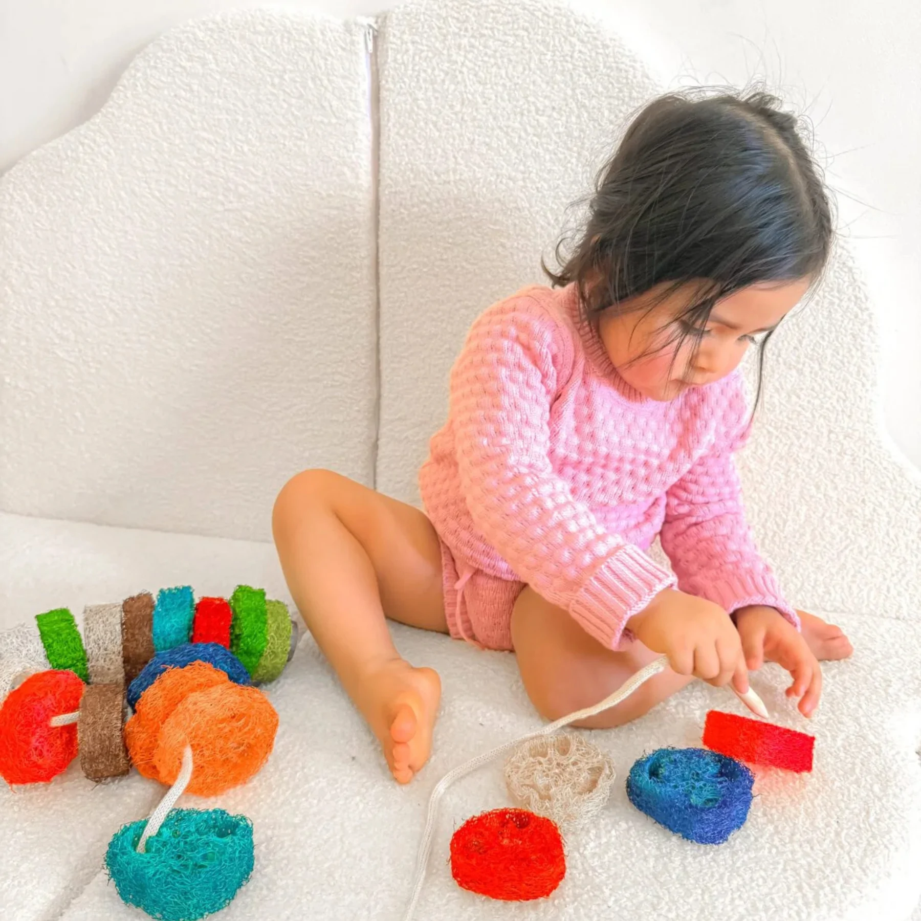 The set is designed for little hands, featuring various colourful loofah pieces that children can lace together to create their own fun designs. As they practice lacing, they strengthen their fine motor skills, hand-eye coordination, and dexterity. The soft, tactile material provides a wonderful sensory experience, making it ideal for sensory play and exploration. 🧵💕