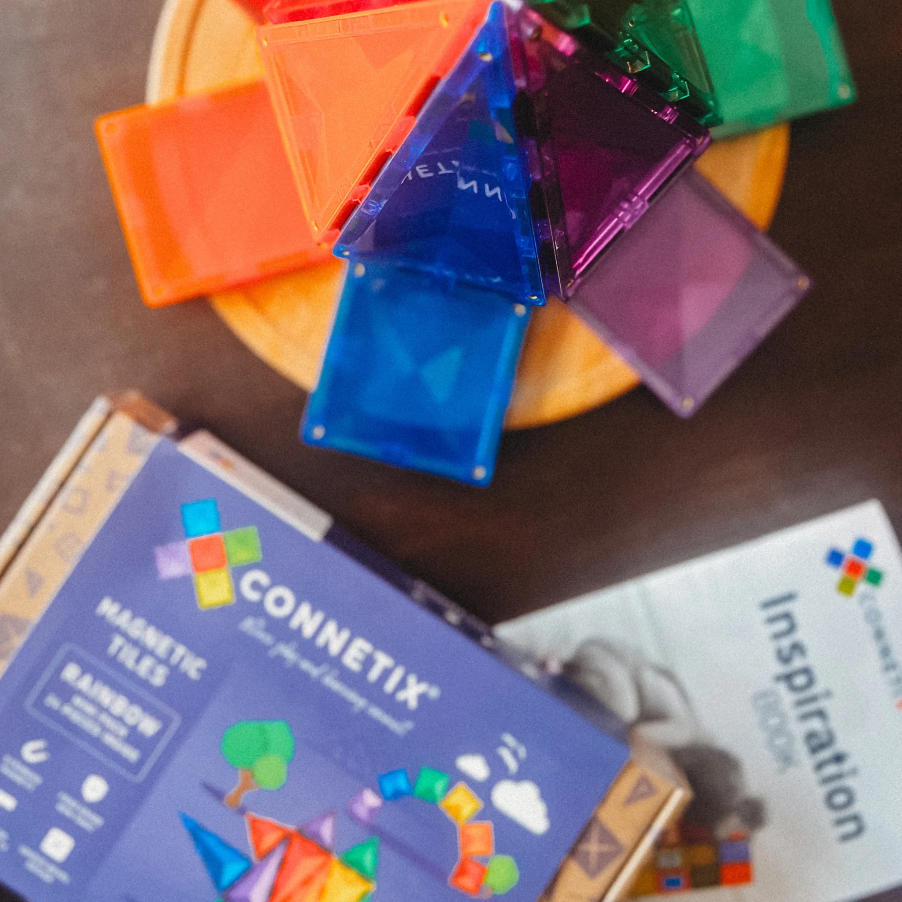 - 24 magnetic tiles in vibrant rainbow colours
