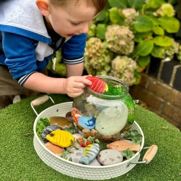 Made from a durable stone mix, these sturdy fish are designed for both indoor and outdoor play. Children can also press them into playdough to create textured impressions, adding another layer of sensory exploration.