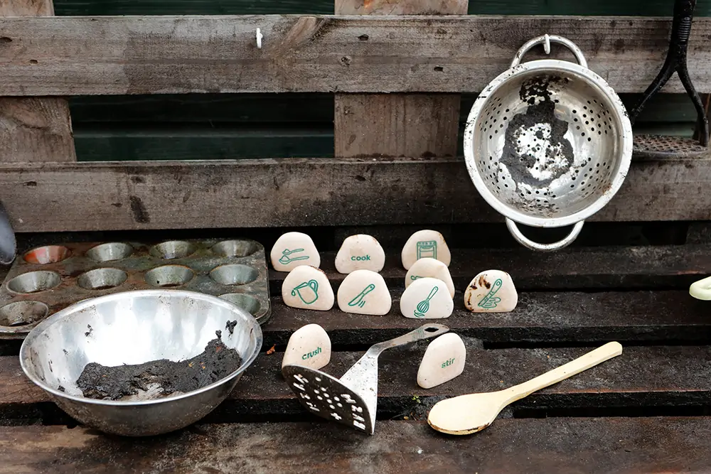 Perfect for mud kitchens, outdoor play areas and learning environments, each stone features a simple engraved image of a cooking action on one side and the corresponding word on the reverse. Children can line the stones up to represent the stages of a recipe, use them to organise tasks or identify different areas for specific cooking activities.