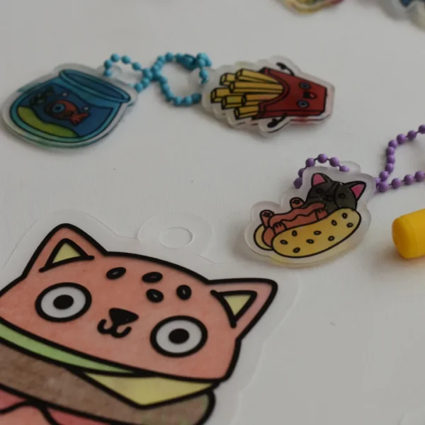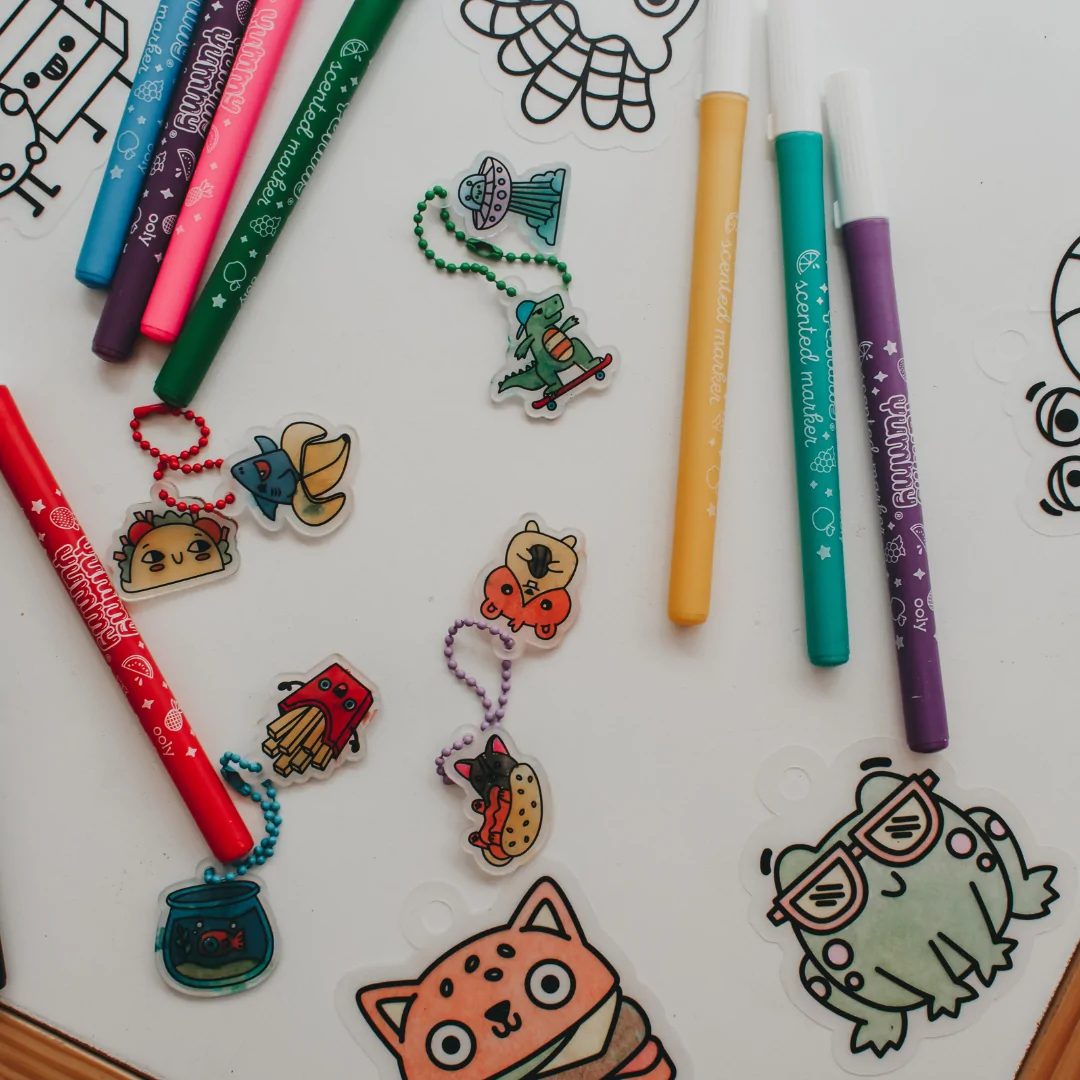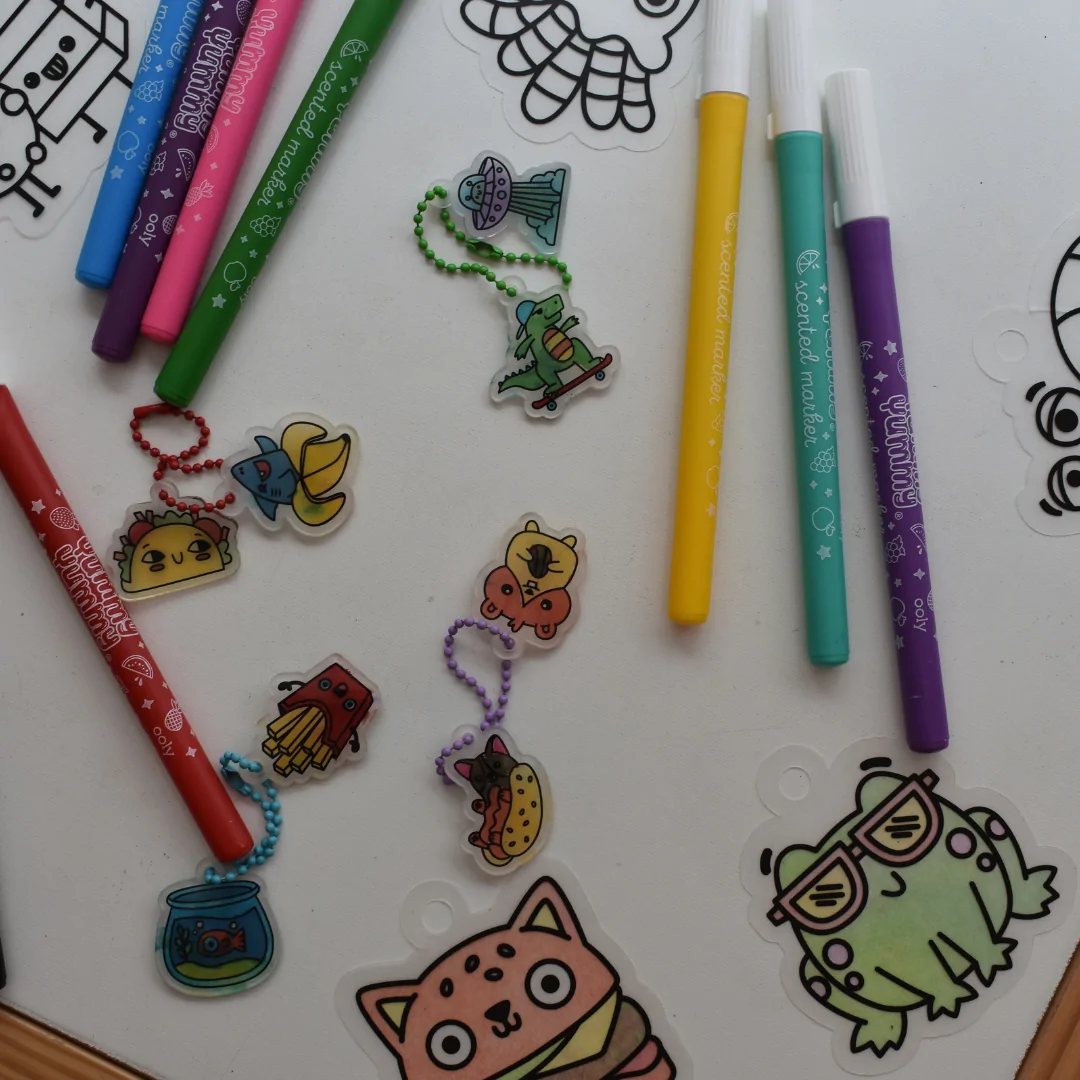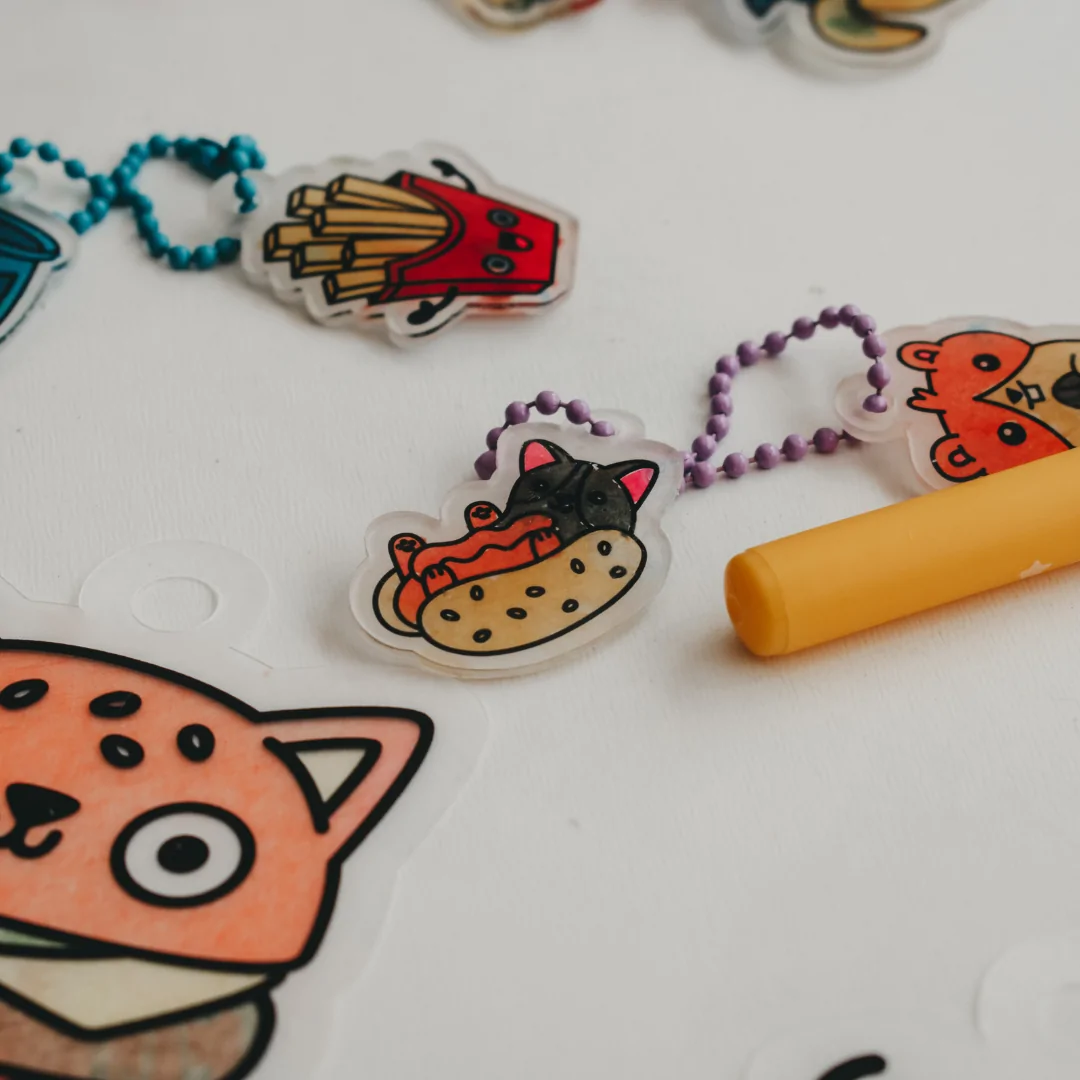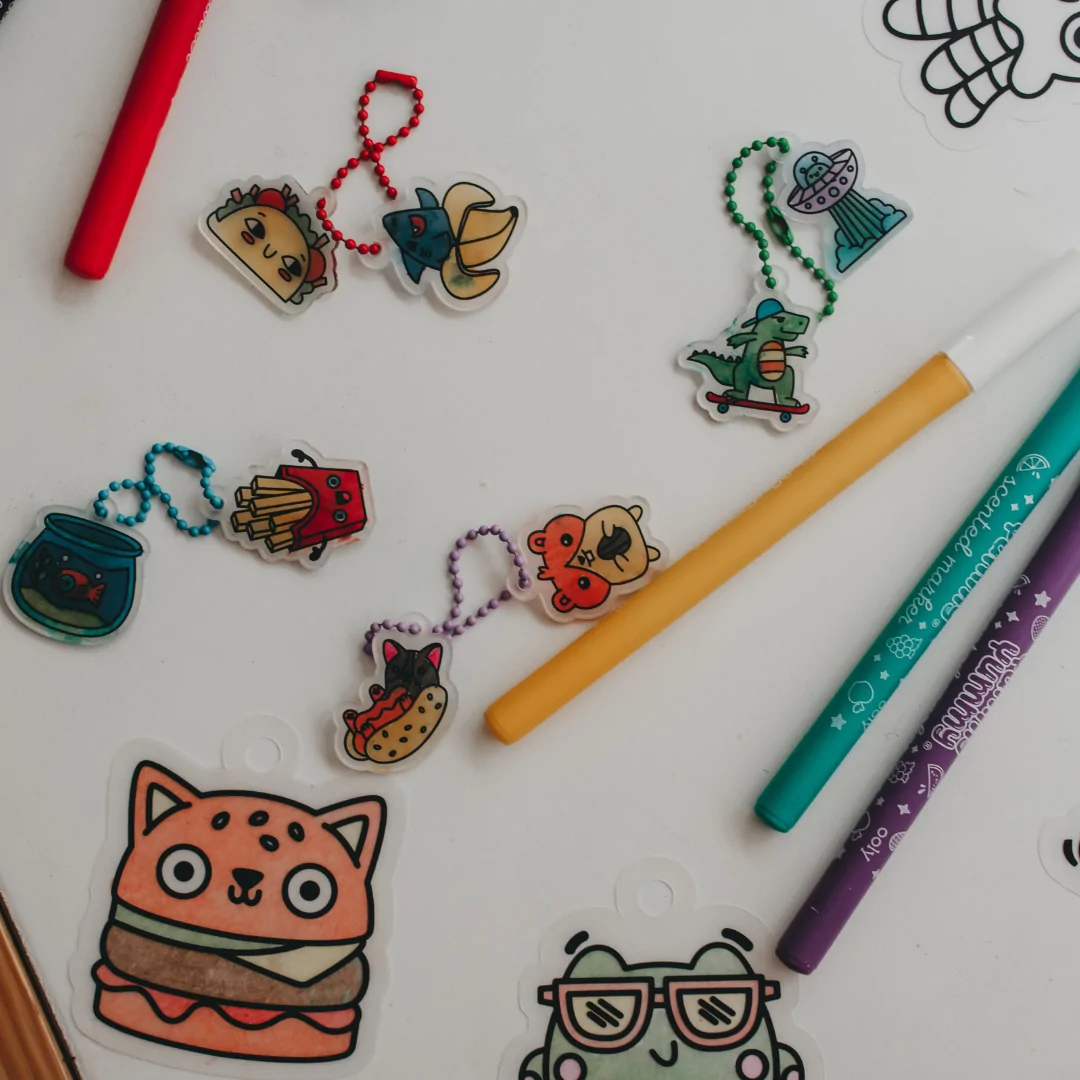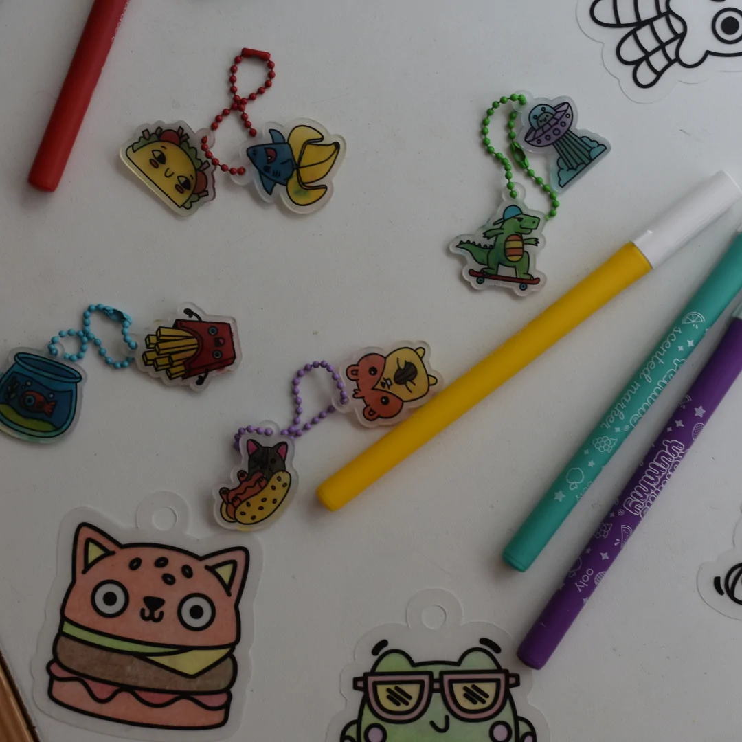 Simply colour the charms with markers or coloured pencils, pop them in the oven, and watch the magic happen as they shrink into sturdy mini charms. Made from lightweight plastic, these charms are perfect for decorating backpacks, keychains, or even creating DIY jewellery.