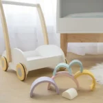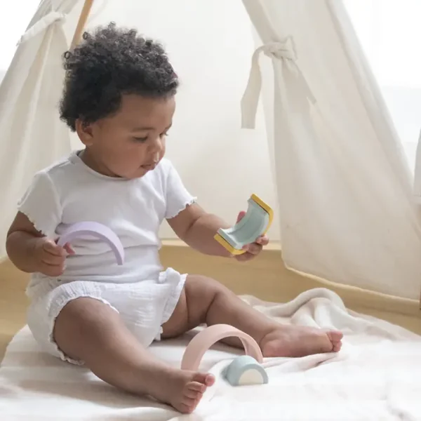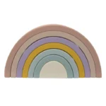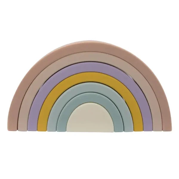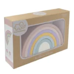 Build rainbows, towers, archways and creative sculptures with this bright and colourful silicone rainbow puzzle. Designed for little hands, this open ended toy encourages imaginative play while also supporting the development of hand eye coordination and fine motor skills.