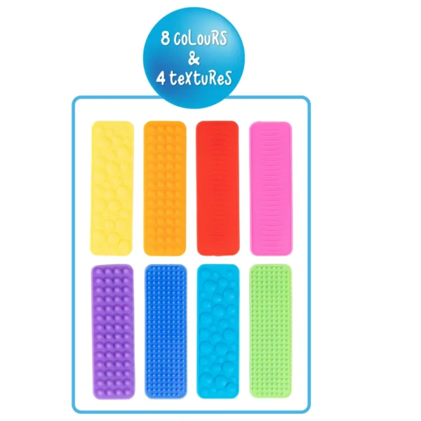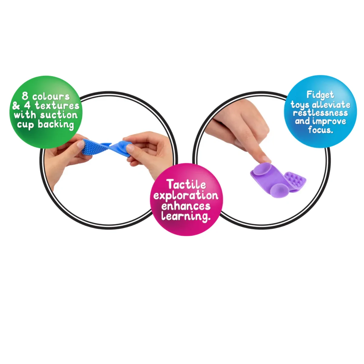 The suction cup backing allows each strip to be easily attached to desks, tables or laptops, making them ideal for quiet fidgeting without disruption. Their low profile design supports self regulation and attention while remaining unobtrusive in classroom and learning environments.
