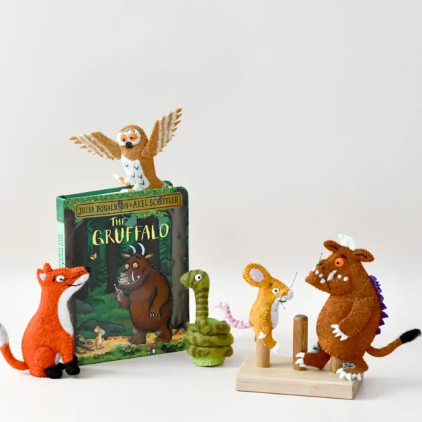 Bring the beloved story of The Gruffalo to life with this delightful handcrafted finger puppet set by Tara Treasures. Designed to inspire interactive storytelling and imaginative play, this set includes all your favourite characters from the classic book – Mouse, Fox, Owl, Snake, and of course, the Gruffalo himself!
