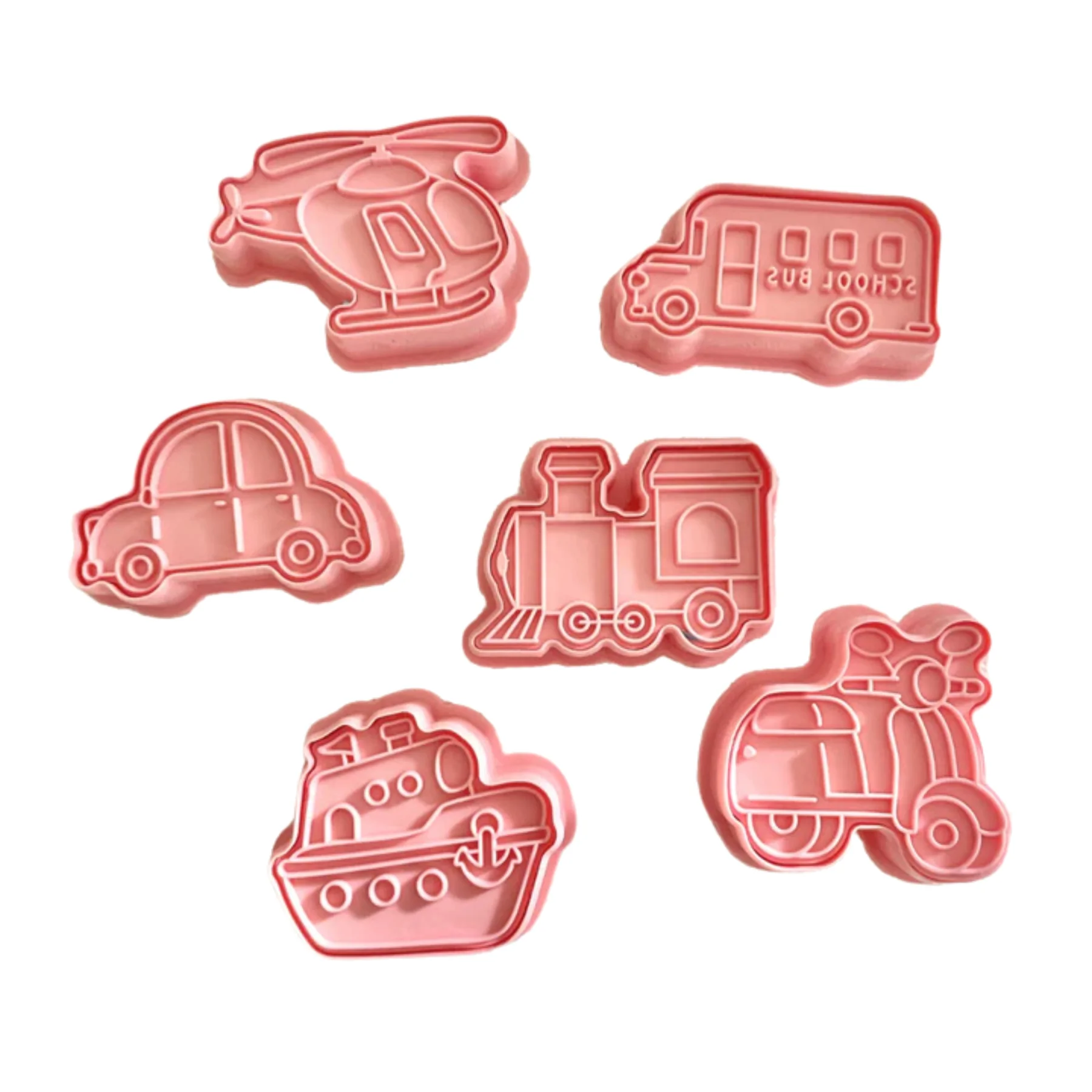 Includes 6 transport-themed stampers and 6 matching cutters