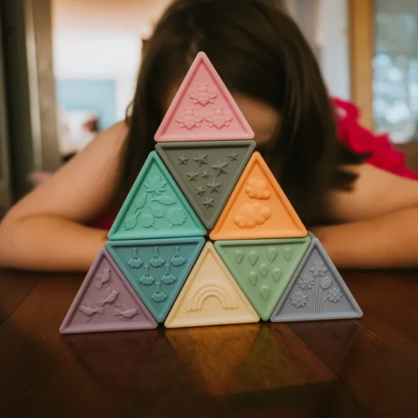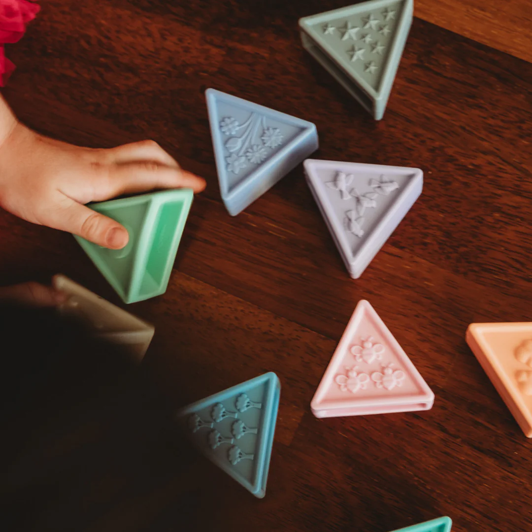 Build, stack, and learn with the Jellystone Designs Triblox! These 9 vibrant triangle blocks are made from toxic-free silicone, making them safe for little hands to explore. Perfect for open-ended play, each block is numbered 1 to 9, with a corresponding illustration on the other side to help reinforce counting, shape recognition, and tactile exploration.