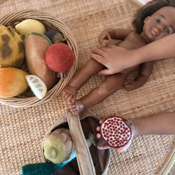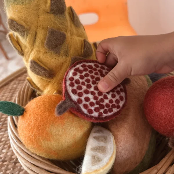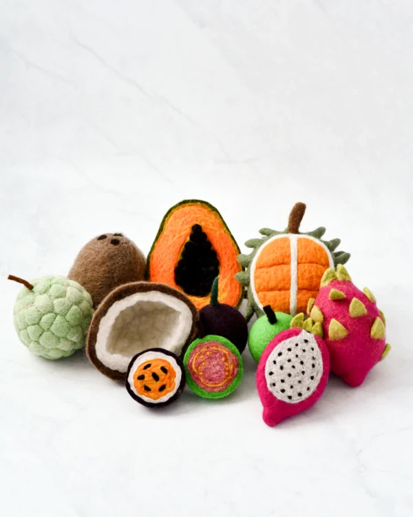 Designed to spark curiosity and creativity, this beautifully crafted collection introduces little ones to a world of exotic flavours while encouraging role-play, sensory exploration, and early discussions about healthy eating. Each fruit is lovingly handmade to resemble its real-life counterpart, making it an exciting addition to any play kitchen or learning space.