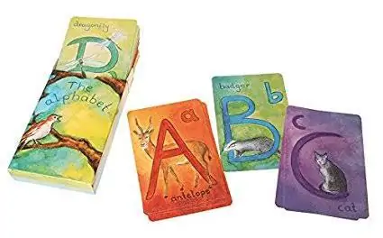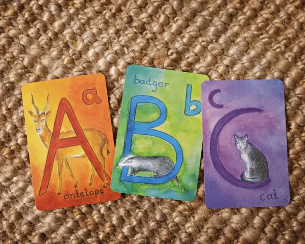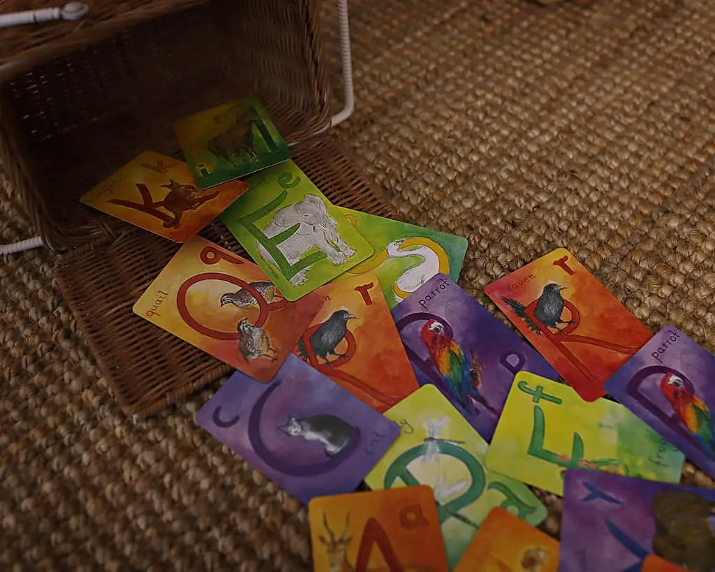 Grimm’s spiel & Holz waldorf alphabet cards. Which sound belongs to which letter? With the endearing animal drawings on our abc cards children connect picture, word and sound. This makes them a playful entry into the otherwise abstract world of letters. These colourful cards invite word building and fun games, helping the first writing and reading practice.