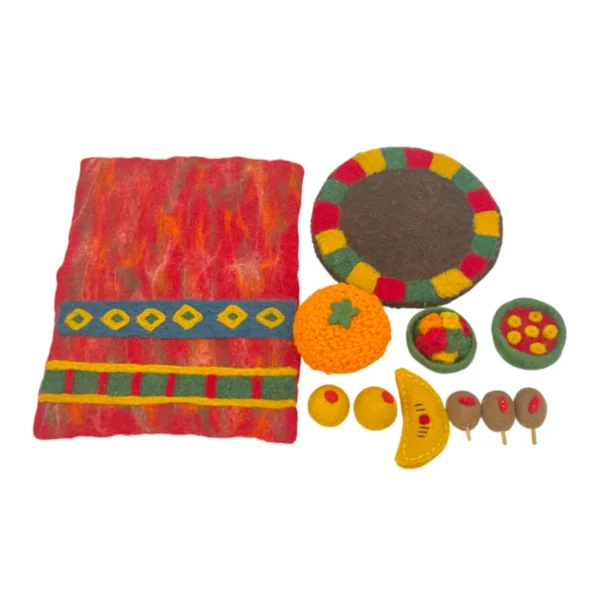 Perfect for play kitchens, café setups or small world play, the set includes a woven mat, plate and a variety of felt food pieces representing ingredients and sides traditionally enjoyed with jollof. Children can serve, share and create their own mealtime stories while developing social skills and creativity.