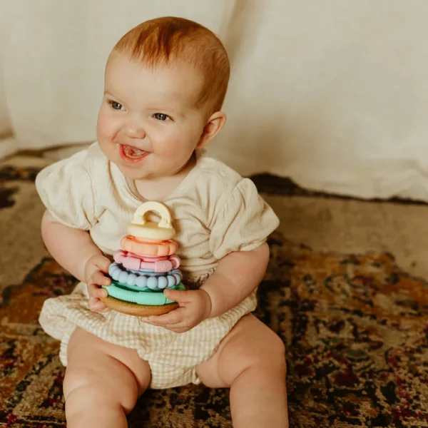 Babies can remove and rearrange the smooth, pastel-coloured rings in any order, encouraging open-ended play and helping develop fine motor skills and hand-eye coordination. The wobbling base invites cause-and-effect learning, movement, and giggles with every nudge.